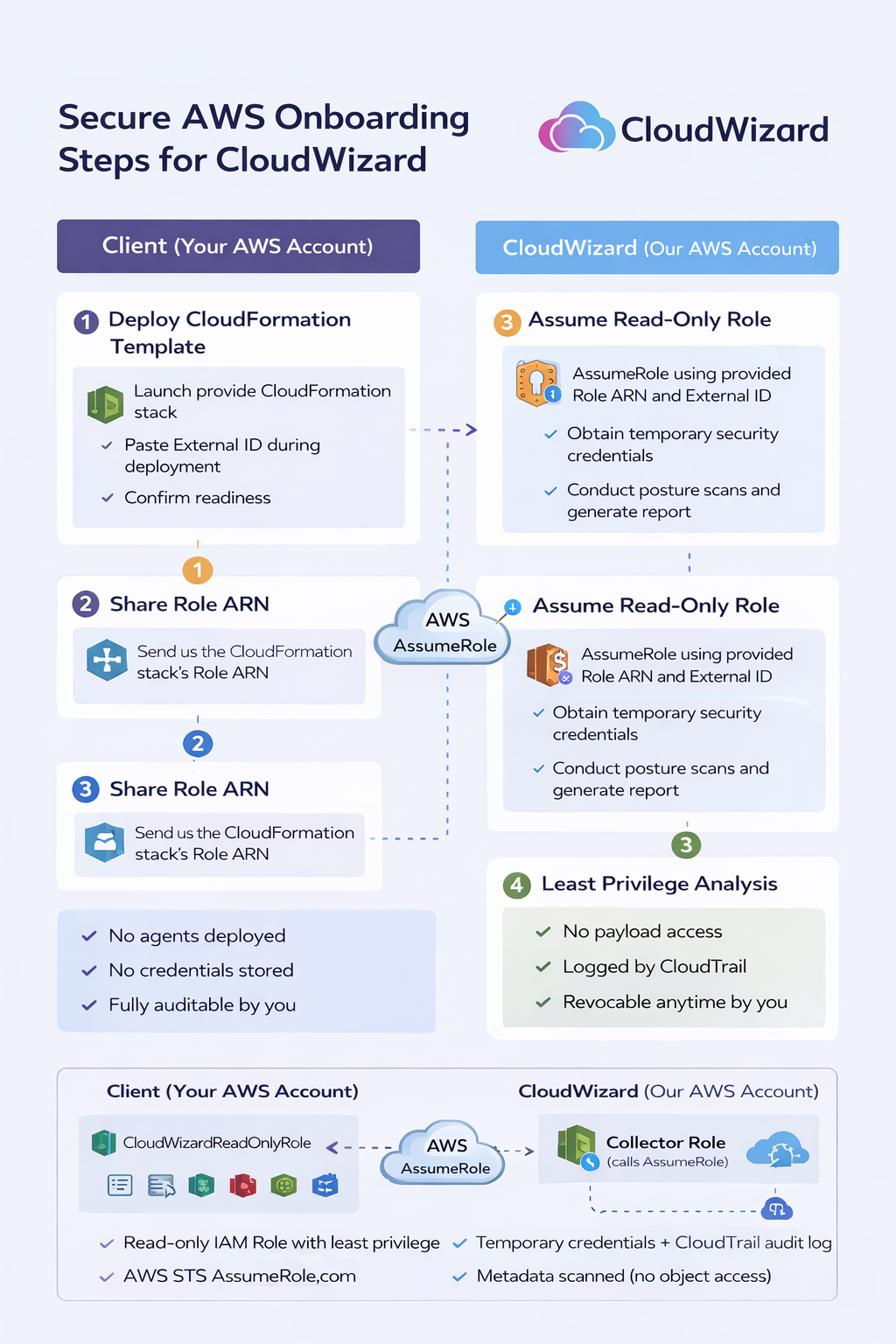 CloudWizard assumes this role using short-lived STS credentials that automatically expire. No static access keys are created or stored. Access occurs exclusively through standard AWS API calls.